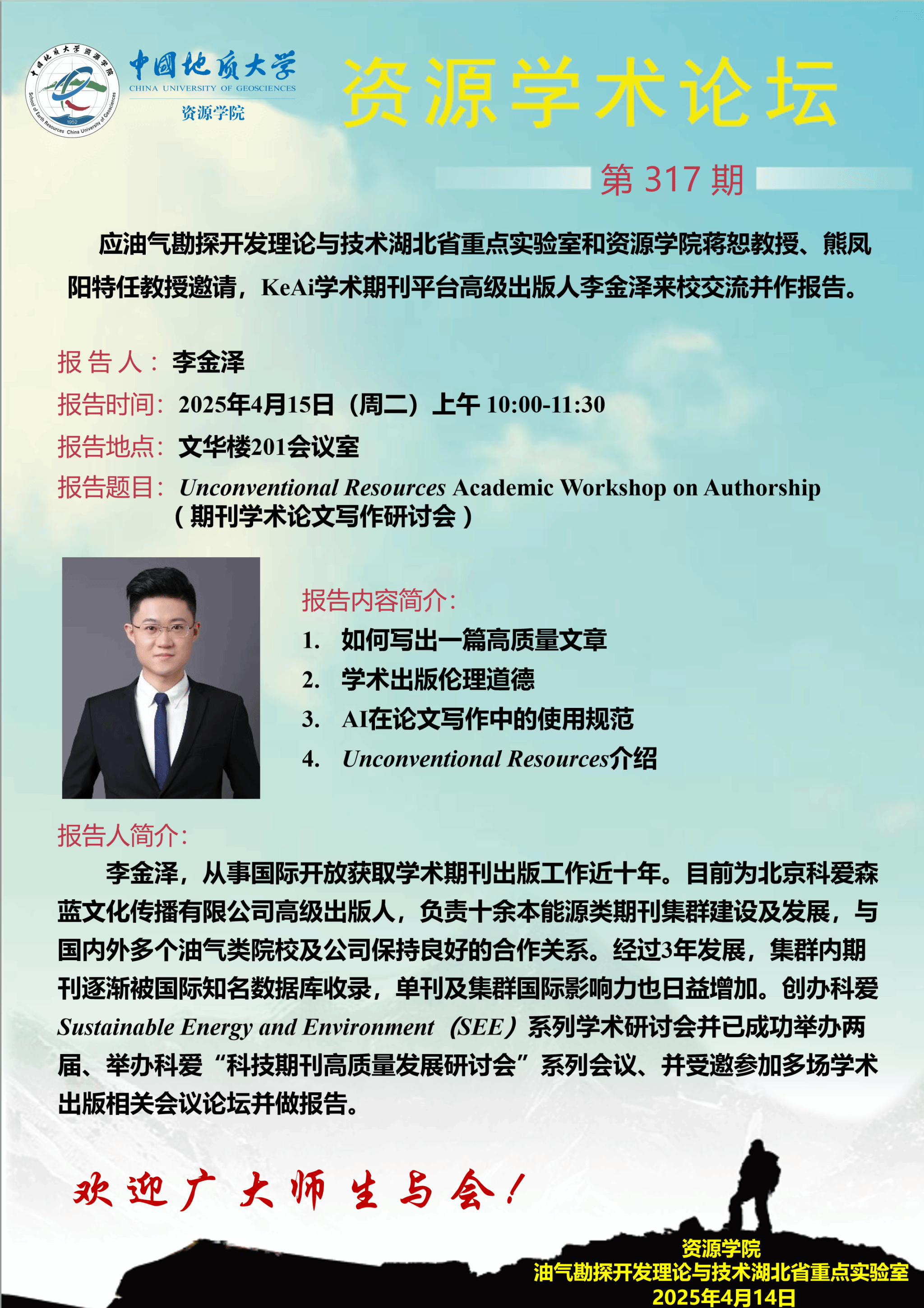 【4月15日】第317期资源学术论坛:李金泽学术报告