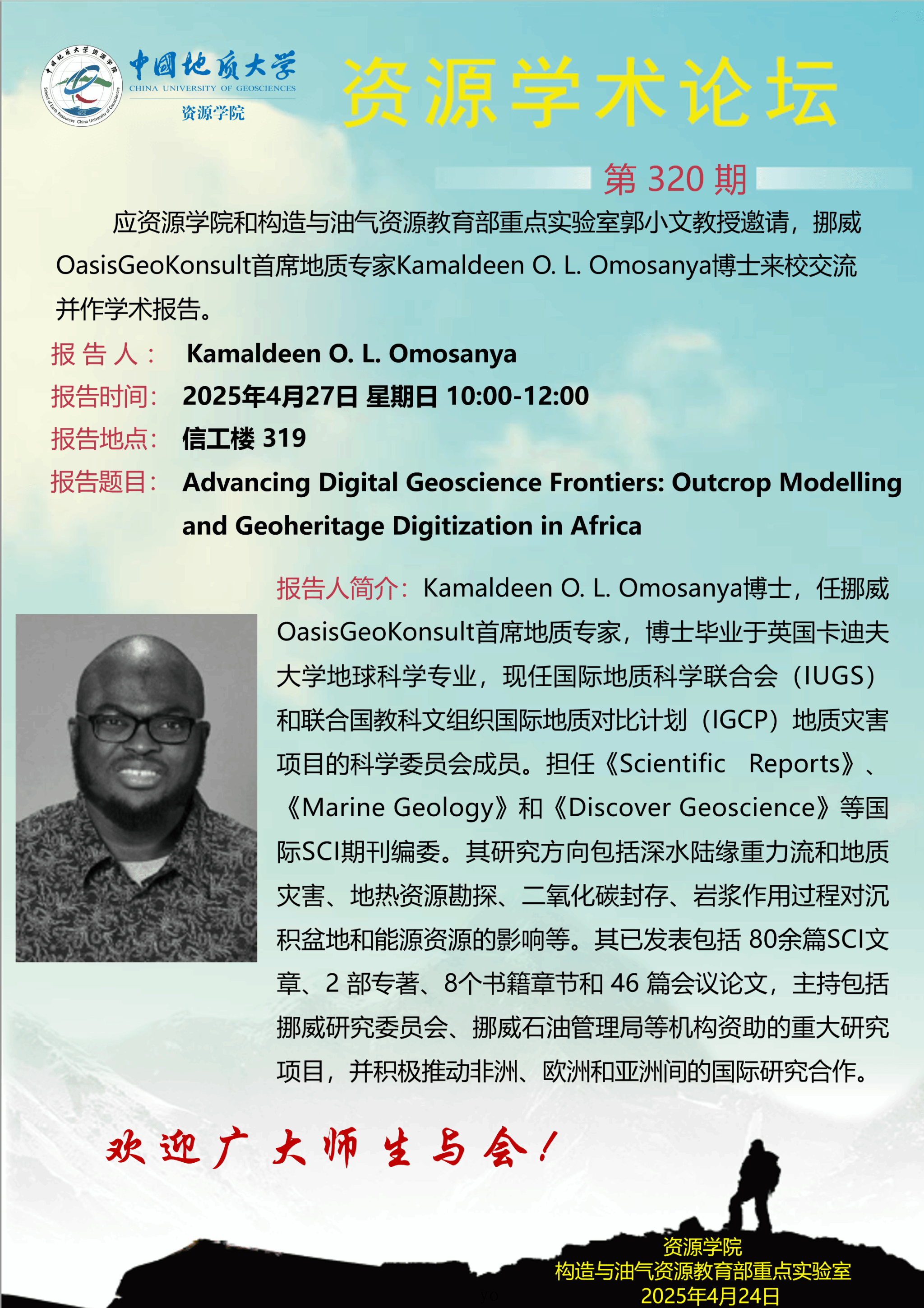 【4月27日】第320期资源学术论坛:Kamaldeen O. L. Omosanya学术报告
