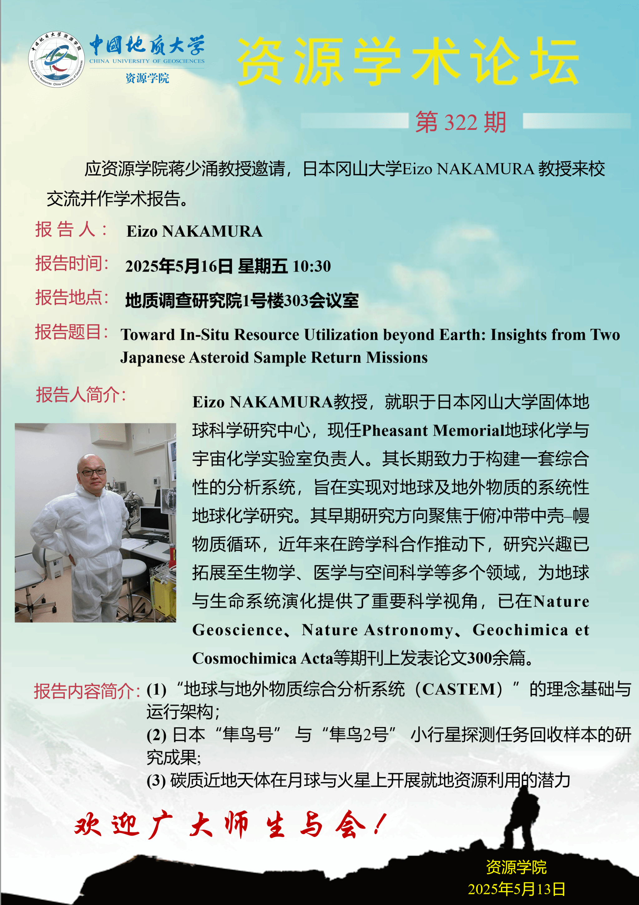 【5月16日】第322期资源学术论坛:Eizo NAKAMURA学术报告