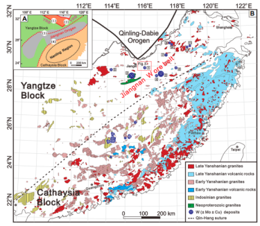 图1.江南钨成矿带简图及研究区位置(据Zhou et al., 2006; Su and Jiang, 2017修改)