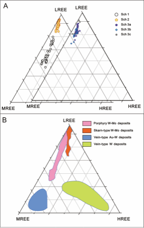 在不同世代白钨矿的LREE-MREE-HREE三元图解中(图9A),Sch2和Sch3表现出明显的LREE富集特征,而Sch1则富集LREE和MREE。阳储岭矿床中所有白钨矿投点均在斑岩钨钼矿床范围,这些投点与热液脉型Au-W和W矿床的区域相距甚远(图9B)。基于上述发现得出结论,白钨矿的精细研究能够有效地追踪斑岩型钨成矿作用的过程,并且能够为区分不同成因类型的白钨矿提供参考。