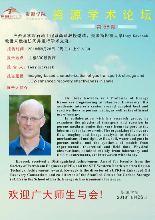 【8月28日】第五十八期资源学术论坛:Tony Kovscek 教授学术报告