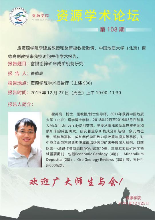 【12月27日】第108期资源学术论坛:翟德高学术报告