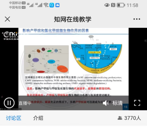 研讨会期间,各专家学者以“煤层气生物工程与碳减排”为主题,结合了自身的研究工作,进行了深入的探讨。吉林大学许天福教授、东北石油大学潘哲君教授、中国科公司大学余志晟教授、西安科技大学刘向荣教授、昆明理工大学张登峰教授,分别以“数值模拟在CCUS潜力和安全性评价的应用”、“二氧化碳在煤层中的封存研究”、“煤层气原位生物气化研究进展与现场应用方案探讨”、“新疆低阶煤的微生物降解研究”、“煤储层协同埋存富氧燃煤烟气关键组分与驱替煤层气基础研究”等为题作了专题报告。期间,还有来自中国矿业大学(北京)、太原理工大学、齐鲁工业大学、太原科技大学、 河南理工大学、西北大学、 安徽理工大学、中国矿业大学、煤与煤层气共采国家重点实验室等科研院所等15位专家依次做了主题或专题报告。研讨会现场学术氛围浓烈,线上直播平台反应热烈,最高峰有3700多人同时在线交流讨论。