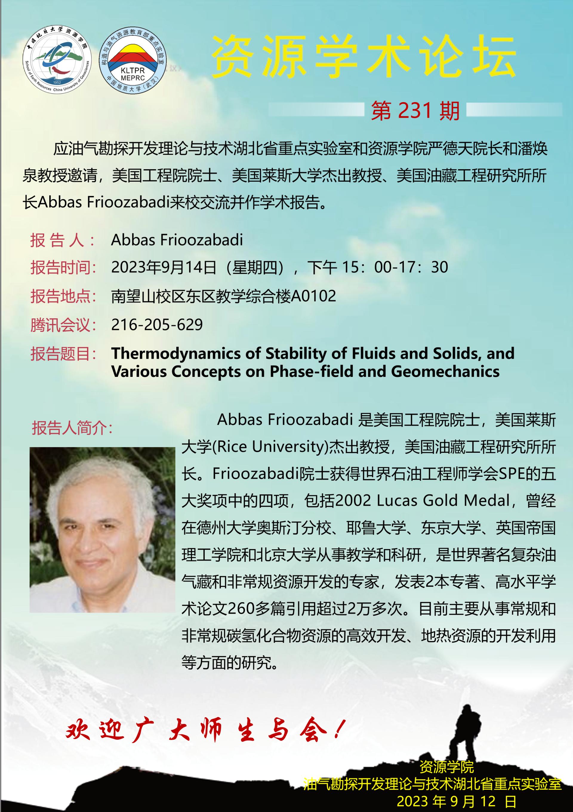 【9月14日】第231期资源学术论坛:Abbas Frioozabadi学术报告