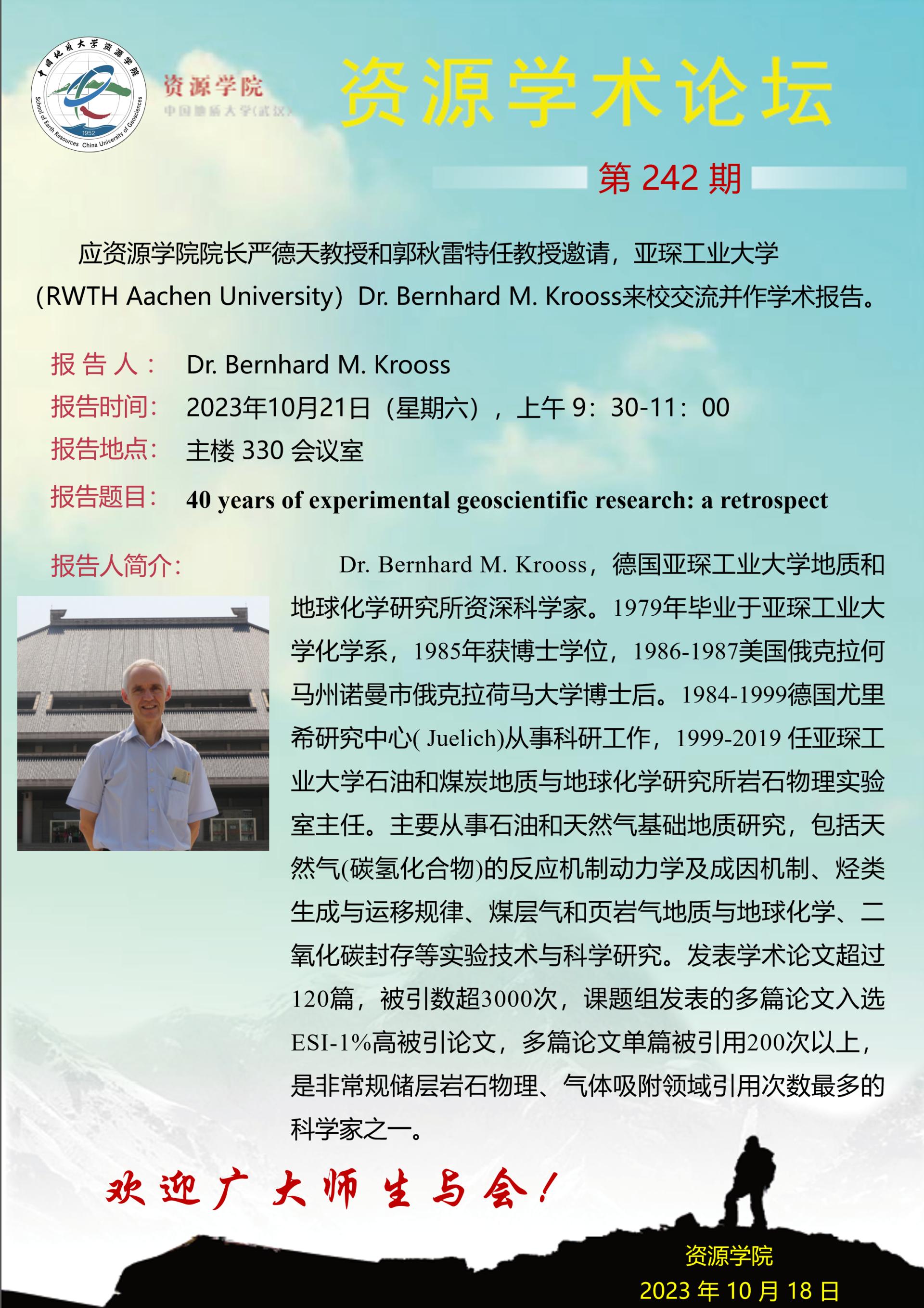 【10月21日】第242期资源学术论坛:Dr.Bernhard M.Krooss学术报告