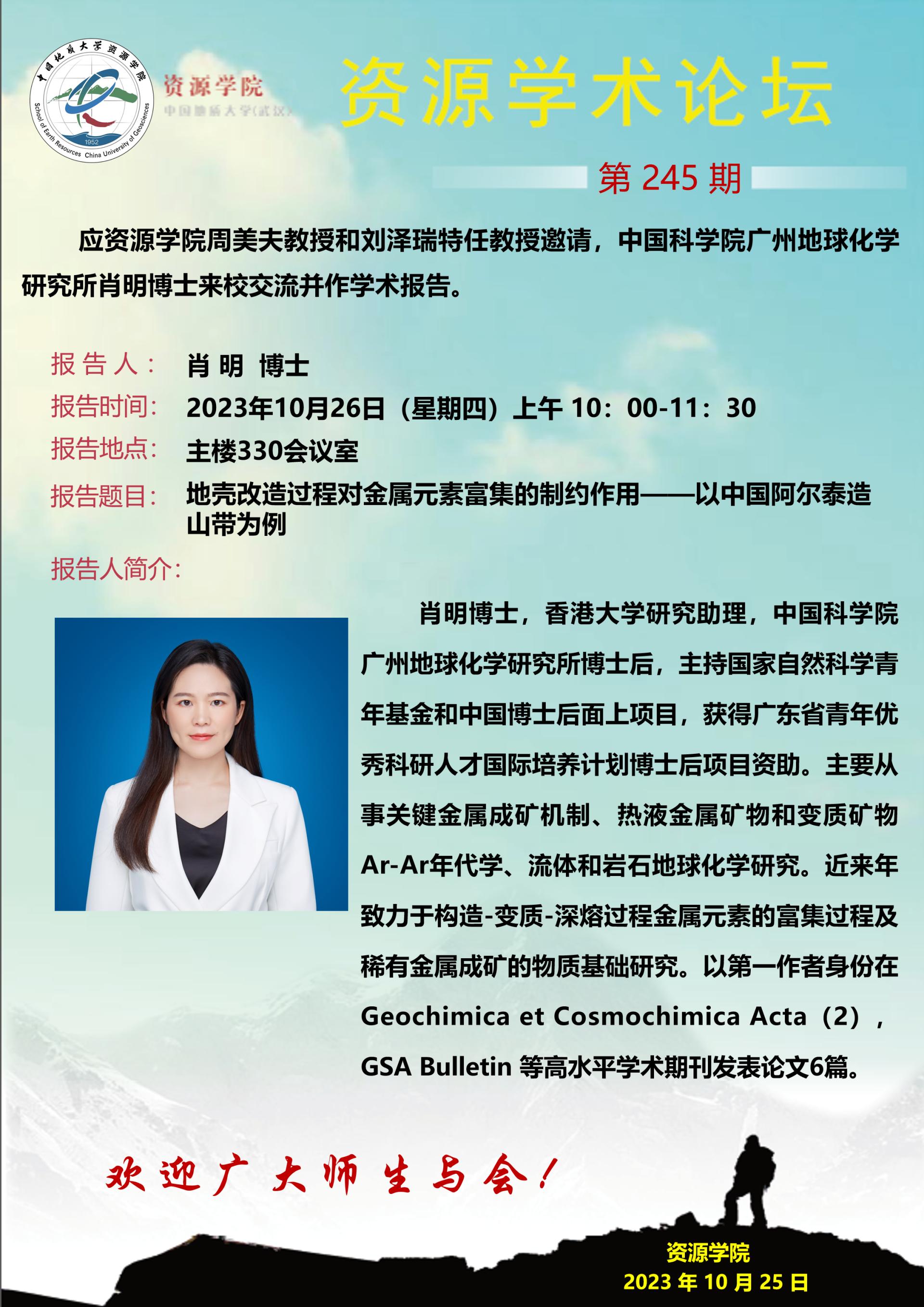 【10月26日】第245期资源学术论坛:肖明学术报告