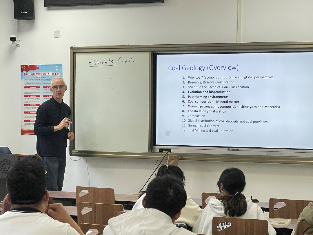 10月24日,Dr.Krooss在东区综合楼B0110为盆地矿产系21级、22级本科生讲授了一堂生动的煤地质学课程。Dr.Krooss循序渐进地介绍了煤的演化和生物合成、泥炭的形成环境、煤岩石组分以及煤化作用和成熟度等理论知识。让员工们对这个领域有了更深入的理解,同时也激发了他们对煤地质学的浓厚兴趣。课程结束后,员工们与Dr.Krooss合影留念。