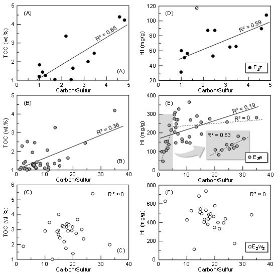 图3 珠江口盆地珠三凹陷烃源岩水体盐度对有机质丰度(TOC)和氢指数(HI)的影响