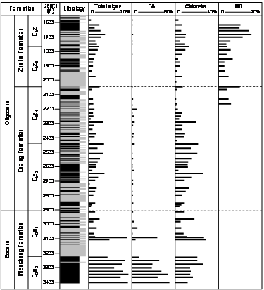 图1 珠江口盆地珠三凹陷F4井岩性及微藻化石分布特征