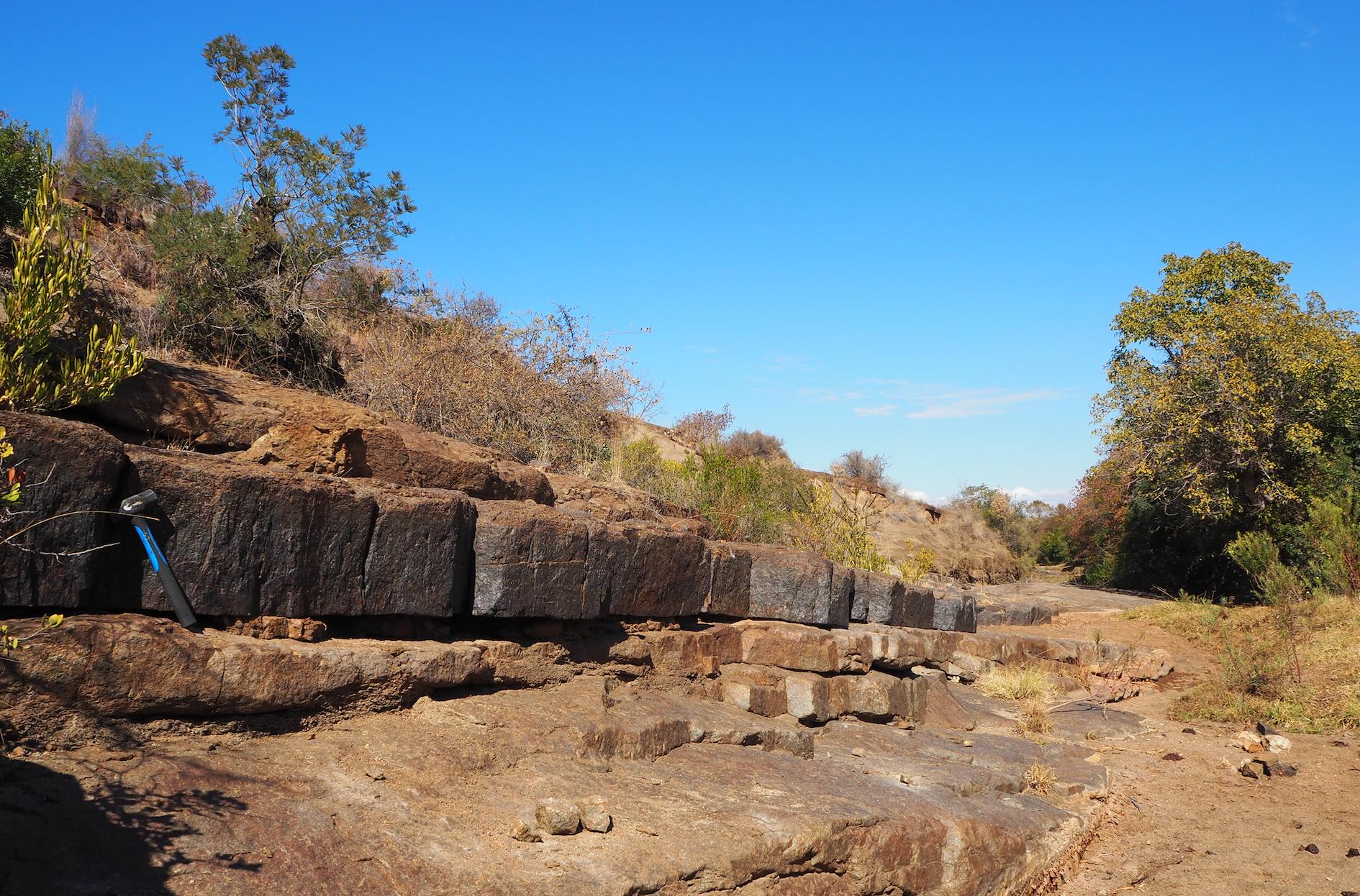 图3 南非Bushveld岩体的上部磁铁矿层(地质锤所放位置)