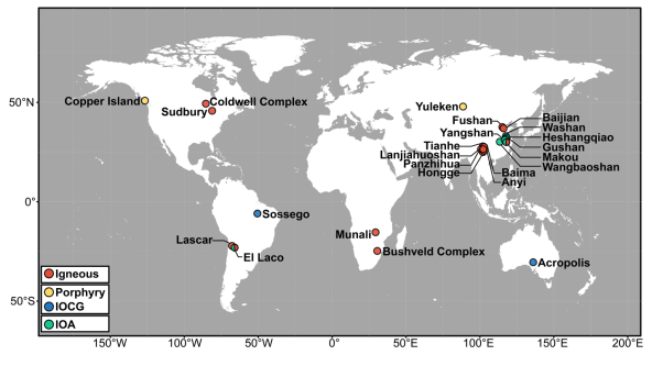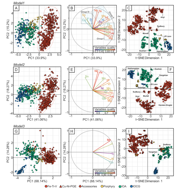2021届硕士毕业生胡斌和博士后曾丽平,在导师赵新福教授指导下,收集了全球典型高温成矿系统,包括岩浆成因矿床(钒钛磁铁矿、铜镍硫化物矿床)、高温热液矿床(斑岩铜矿、IOCG矿床)、IOA矿床及相关的岩浆岩中已发表的原生高钛磁铁矿的LA-ICP-MS元素数据(图1),对数据集进行了两种无监督方法(主成分分析[PCA]和t分布随机邻域嵌入[t-SNE])的机器学习分析,通过大数据统计分析和建立机器学习模型,建立了不同成因高钛磁铁矿的微量元素组成特征。