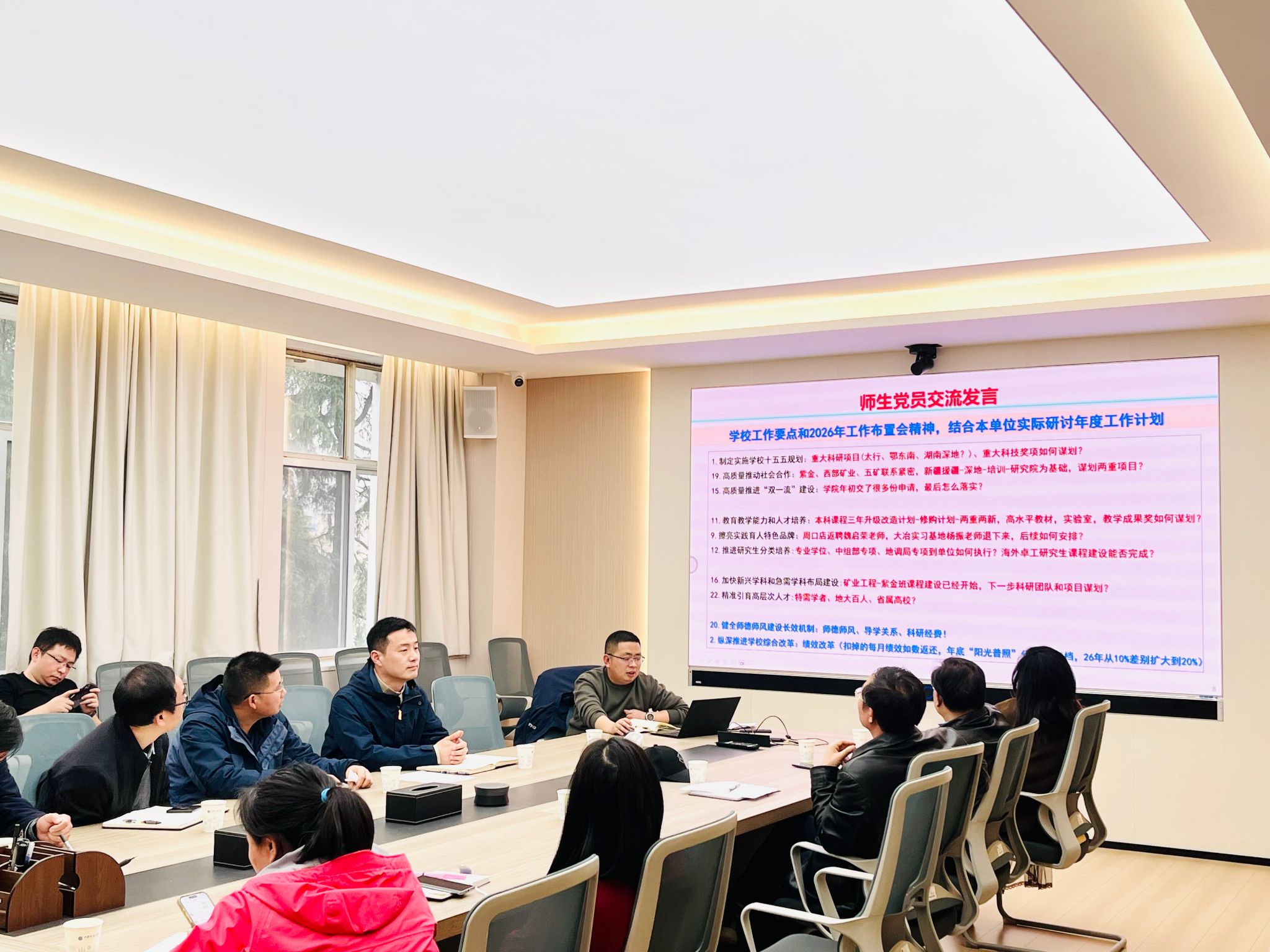 在交流研讨环节,蒋少涌、吕新彪、赵葵东、靳晓野、徐耀明、陈鑫、孙华山等教师代表围绕公司“十五五”发展积极建言献策。大家认为,应前瞻谋划重大科研布局,统筹推进重大项目与科技奖项培育;深化与头部矿山企业合作,提升服务国家战略能力。在公司产品方面,应推进本科课程升级改造,统筹教材、实验平台与教学成果奖培育,持续优化实践育人基地建设;完善研究生分类培养体系,提升专业学位与专项计划实施质量。同时,要加快新兴与急需学科布局,深化校企协同育人,强化科研团队与项目一体化发展,并通过多渠道精准引育高层次人才,为公司高质量发展提供有力支撑。