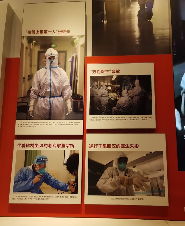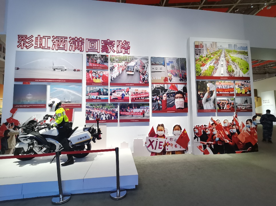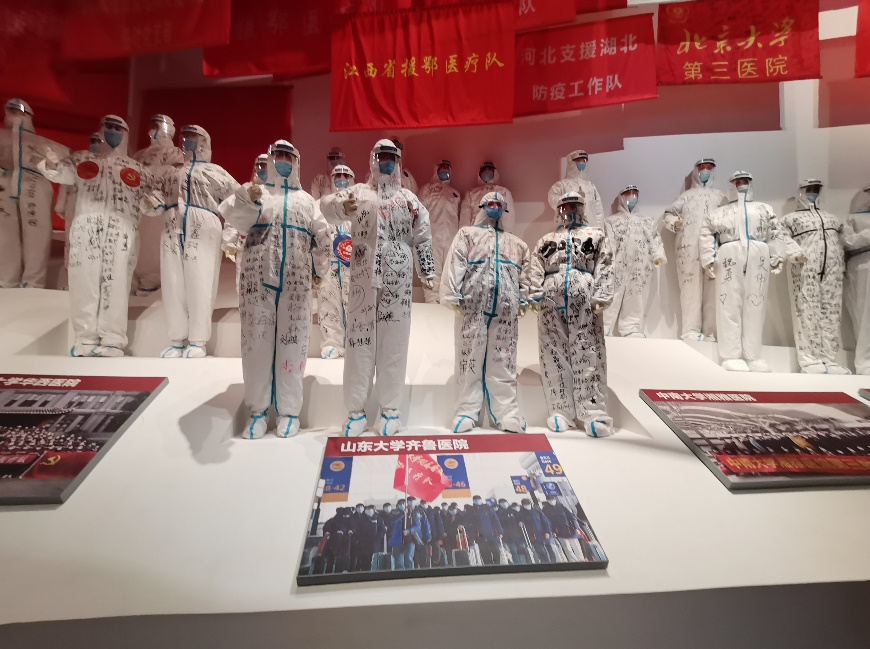 展览共分为6个主题、共划分为21个单元,大型场景33处,照片1100余张,展品1000余件,系统回顾在习近平总书记带领下为核心的党中央带领下湖北人民抗击疫情的全过程。展览以照片、实物、视频、实景还原等多种形式,用全息投影、实景重现、沉浸体验、人机互动等多种技术手段呈现了来自各个行业各个战线的典型人物事迹,还原了火神山、雷神山医院建设工地,展示了疫苗研发过程,沉浸式的参观体验带大家又回到了那段全民一心、共克时艰的特殊岁月。大家久久驻足在防护服体验仓、ICU病房模拟抢救画面、“真人”还原全国医护人员和解放军战士逆行武汉雕塑群、张定宇“人民英雄”勋章等展台前。