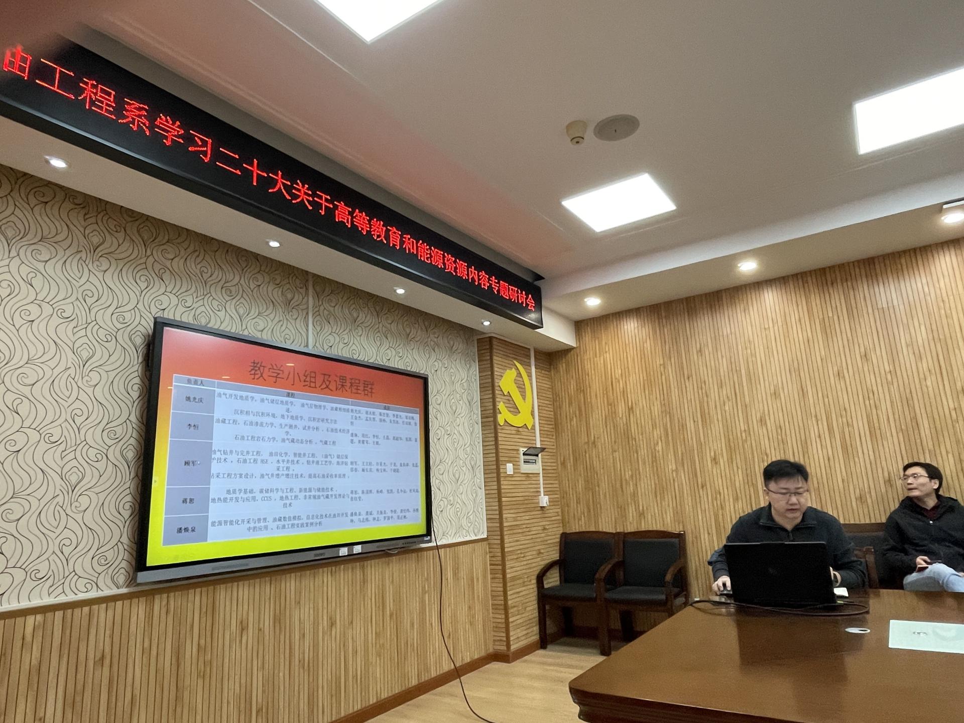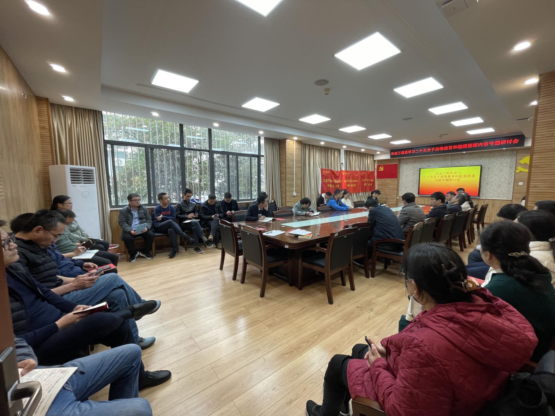 (通讯员:高旭东)深学细悟抓落实,立足本职建新功。11月24日上午,石油工程系在文华楼201召开学习党的二十大精神学习会,重点学习报告中关于高等教育和能源资源的相关内容。石油工程系全体教师、研究生党支部、本科生党支部员工代表参加会议。系党支部书记谢丛姣教授主持会议。