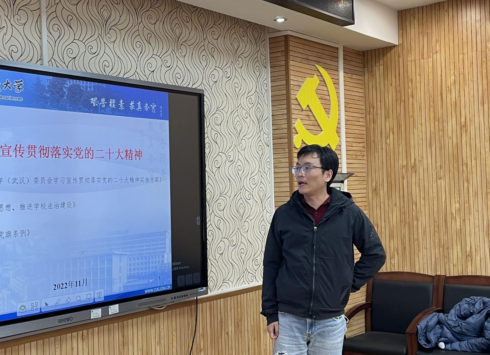 支部委员张琪同志领学了《中共williamhill威廉官网(武汉)委员会学习宣传贯彻落实党的二十大精神实施方案》、习近平法治思想和《中国共产党党徽党旗条例》等内容。张琪同志强调要把全体师生员工的思想和认识统一到党的二十大精神上来,把智慧和力量凝聚到党的二十大确定的各项任务上来,凝聚到实现公司“十四五”规划确定的各项任务上来;要加强法律制度的日常学习,认真执行民法典,加强网络法治宣传教育;要规范使用中国共产党党徽党旗。与会者纷纷表示作为党员责任重大、使命光荣,要把党的二十大精神学习融入到实际教学、科研工作中。