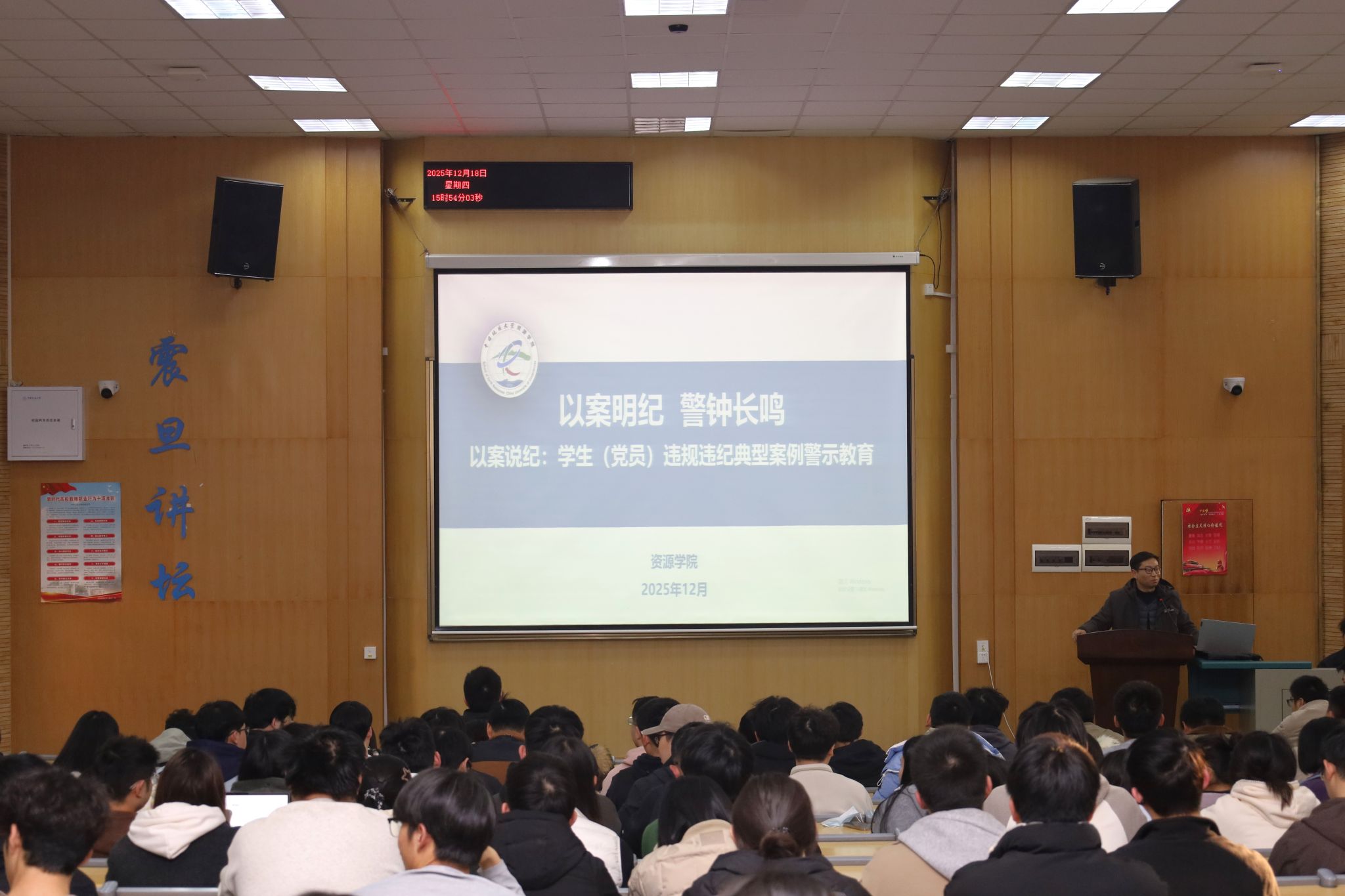 会上,谭文伦以“以案明纪、警钟长鸣”为主题开展警示教育,通过典型案例剖析违纪行为的严重危害,重申校纪校规的刚性约束。他强调,全体员工须将纪律要求内化于心、外化于行,自觉做到遵规守纪。针对案例中发表不当言论、学术不端等问题,他强调党员必须垂先示范,在坚定政治立场、恪守学术诚信、规范日常言行等各方面走在前列,主动维护纪律的严肃性,以自身的清正言行带动广大同学共同营造风清气正的校园环境。