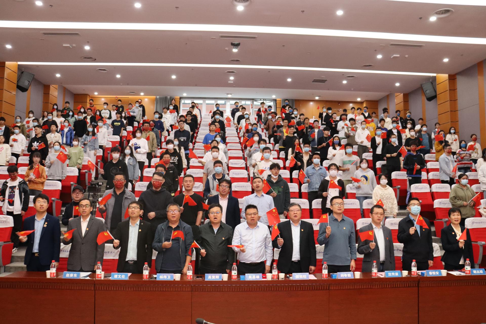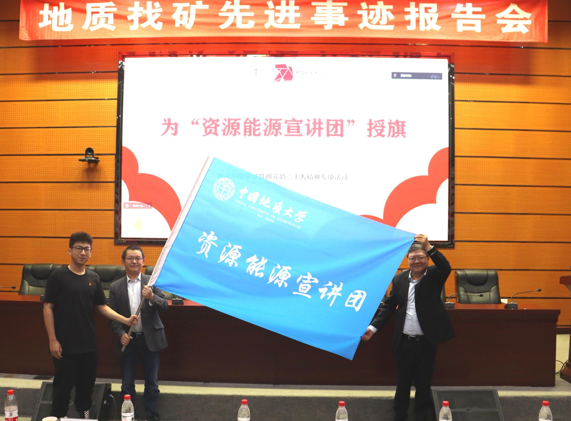 储祖旺为William威廉英国官网“资源能源宣讲团”授旗。武汉市委宣讲团成员、副经理沈传波教授,“志留纪”科普平台负责人、资源勘查工程专业2020级本科生吕骏腾代表接旗。