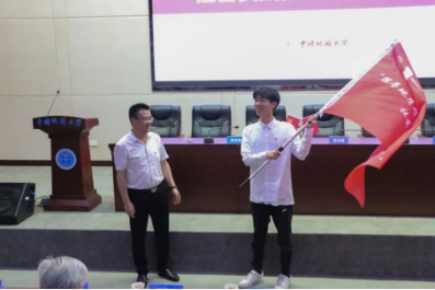 党委员工工作部邬海峰部长为“探寻地质精神 感触七秩荣光”学习之路社会实践团授旗。