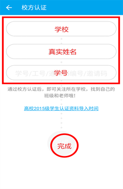 三、 选择校方认证,输入集团、真实姓名、学号、点击完成注册