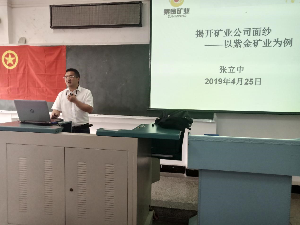 张立中以“揭开矿业公司的面纱”为主题,向同学们介绍了紫金矿业集团有限公司。他从矿业公司的形象与优势出发,结合自身成长发展经历,分享了矿业公司对地质人才的要求,矿业公司的职业发展以及就业建议。他再三叮嘱大家,扎实的专业基础是职业发展的重要基石。另外,地质人才要敢于面向基层,走向一线。