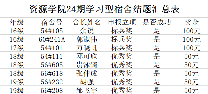 1.标兵奖:宿舍成员无挂科,大三大四年级平均绩点≥3.6,大一大二年级平均绩点≥3.2,人均奖励100元;