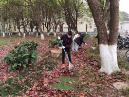 上午8点20分,志愿者们分组集合,领取清扫工具,在校园环卫工人带领下前往相应区域开展清扫活动。扫把挥动间,铺满草地的落叶们抱成了团。在阿姨们的指导下,志愿者们将树叶装上推车,并送至垃圾处理处。