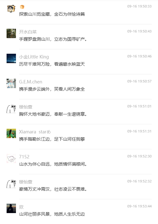一石激起千层浪,百余首地质诗歌在秭归地质实习基地即兴创作。9月15日的茅垭公路云雾缭绕,2022级员工在秭归茅垭村开展地质实习。秭归实践教学团队学术指导刘晓峰老师随队在茅垭村路线中触景有感,即兴吟诵两句七言诗:路线飘在白云间,原来你我是神仙。这两句简短却意境深远的诗句一经转发至实习班级群,便立即引发了同学们的热烈反响和积极参与。在接下来的50分钟里,班上30位同学纷纷作诗对句,将自己对地质实习的感受和对自然之美的感悟融入其中。“手握罗盘测山川,立志为国寻矿产”“携手踏勘长江边,足下山河任我攀”“山水为伴心自远,地质情怀满襟间” “地壳变迁岁月长,岩层叠嶂见沧桑” “芝茅橘柚绿连天,盘山而上百万年” “金钉一落乾坤定,星移物转化心间”等等。同学们以诗传情,以地质为语,不仅展现了地质科学的严谨与浪漫,表达了员工们对地质学科的热爱,更传递了地质人勇于探索、不懈追求的精神风貌,增强了大家作为新时代地质人的身份认同感和使命感。
