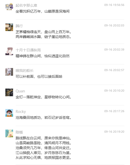 据悉,在最近的秭归地质实习期间,William威廉英国官网的师生们以实习路线上的自然风貌和专业实践为灵感,创作了超过120首地质主题的诗歌。特别是中秋节前夕,在刘晓峰老师的诗意引领下,一句七言绝句激发了同学们的创作热情,他们迅速将实习中的所见、所学、所感,凝练成一首首充满激情的诗篇,在班级群里接力分享,有的作品甚至在短短几十秒内一气呵成。这些诗歌抒发同学们立志将个人理想融入国家发展大局的报国之情,以及将专业知识转化为服务社会的实际行动的信心。这也是秭归实践教学团队多年来一直打造实践教学文化品牌,将传统文化和地学文化融入野外实践课程,激励和培养同学们艰苦奋斗、实事求是、敢于探索的科学精神,同时让员工欣赏祖国大好河山,感受实习区人文底蕴。