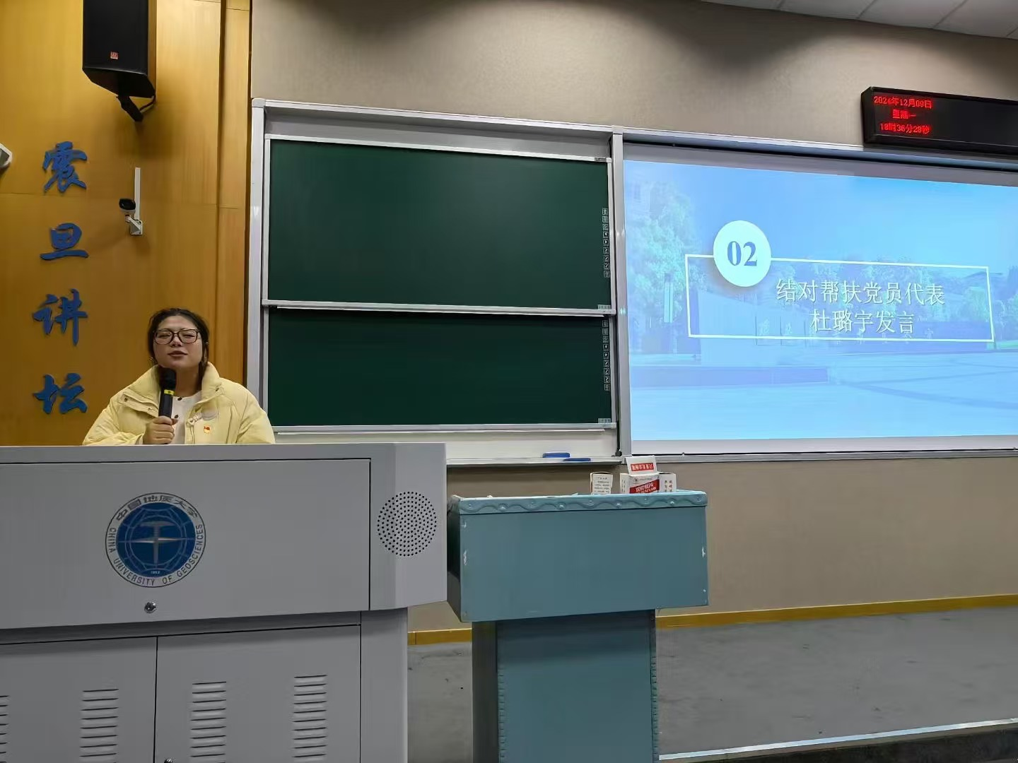员工党员帮扶代表杜璐宇发言。她结合自身学习经历分享了学习经验和帮扶计划,呼吁帮扶党员要与学业困难同学加强联系,帮助结对同学赶上学业进度。
