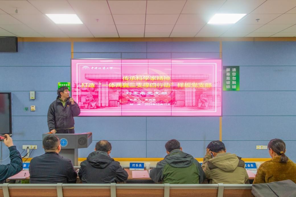 地球物理与空间信息公司刘光鼎党支部黄润林以《传承科学家精神 打造“一体两翼三支撑四行动”样板党支部》为题介绍样板支部培育创建经验。