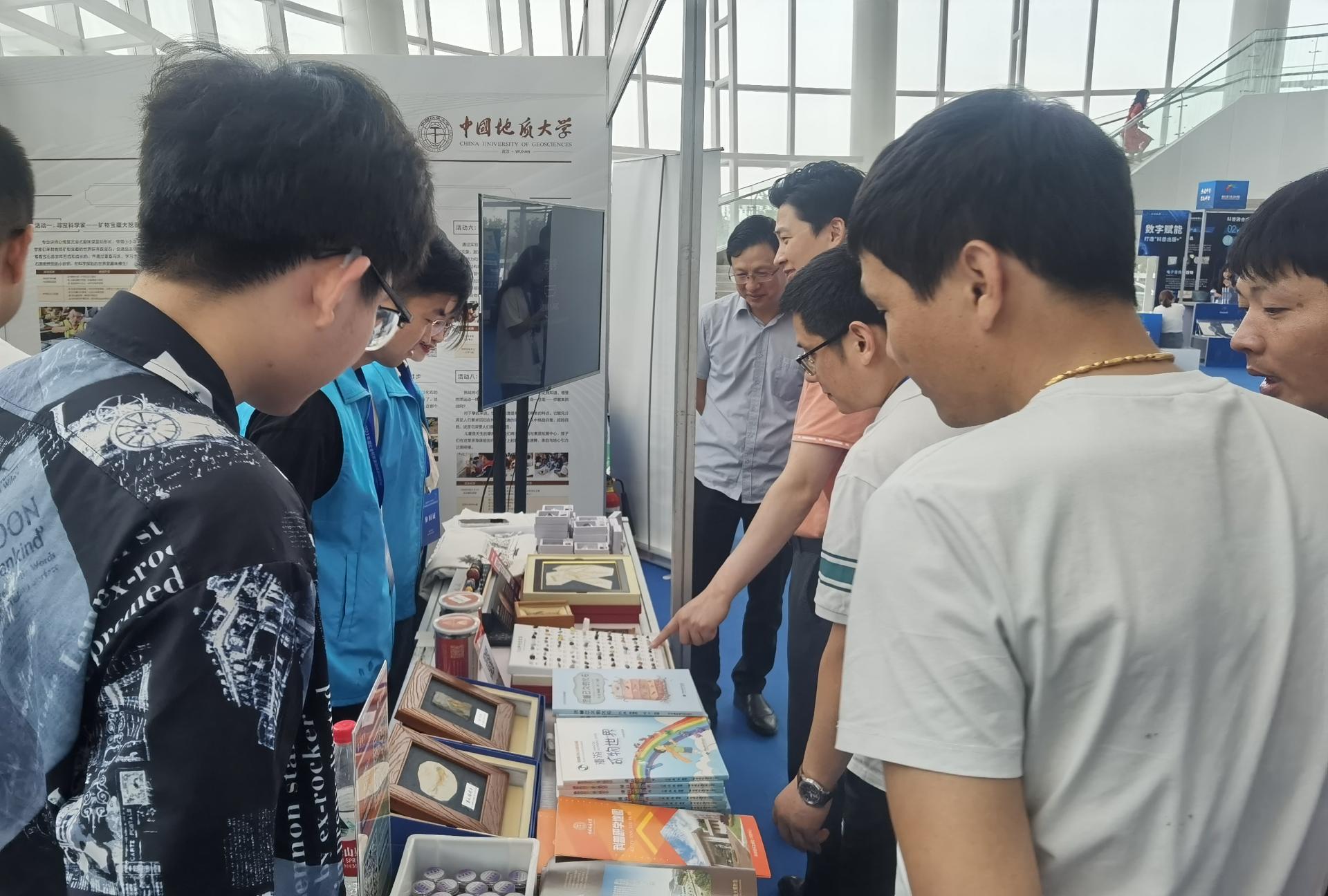 在展演现场,公司科普志愿者向与会人员和公众介绍紫水晶、萤石、玛瑙等矿物的矿物特征,讲述科普研学课程,并利用矿产资源形成与勘查开发VR技术展示地形构造、火山作用、空间科学等虚拟数字模型,受到了热烈欢迎。