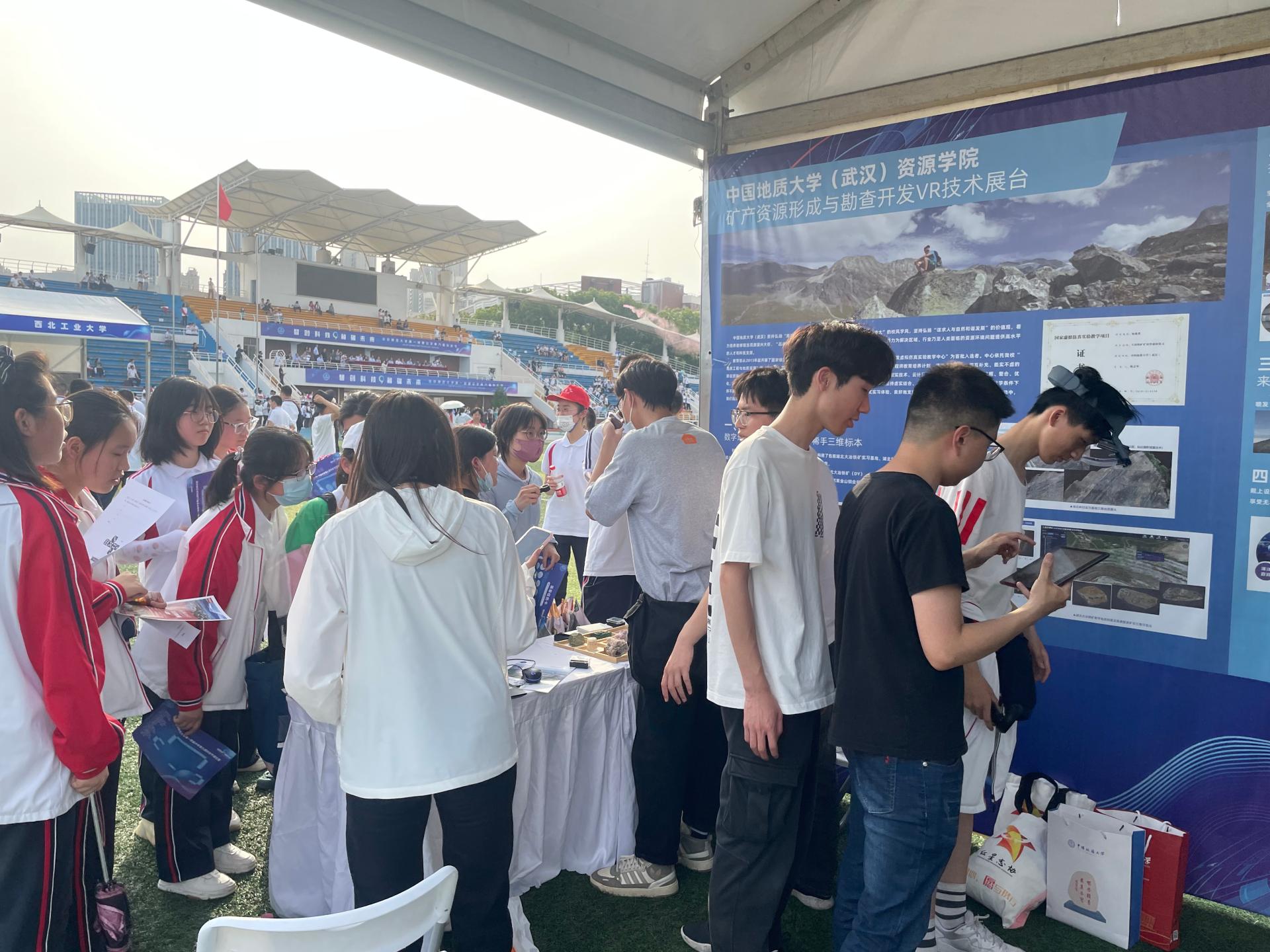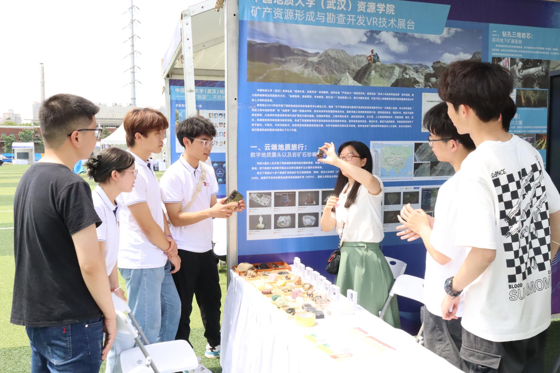在矿产资源形成与勘查开发VR技术展台,华一学子们通过VR设备, “云游”大冶铁矿实习基地、秭归实习基地以及黄石国家矿山公园,直观感受利用钻孔三维岩芯技术探寻地下矿藏奥秘的过程,特别是沉浸式体验了火山作用等大地模型。