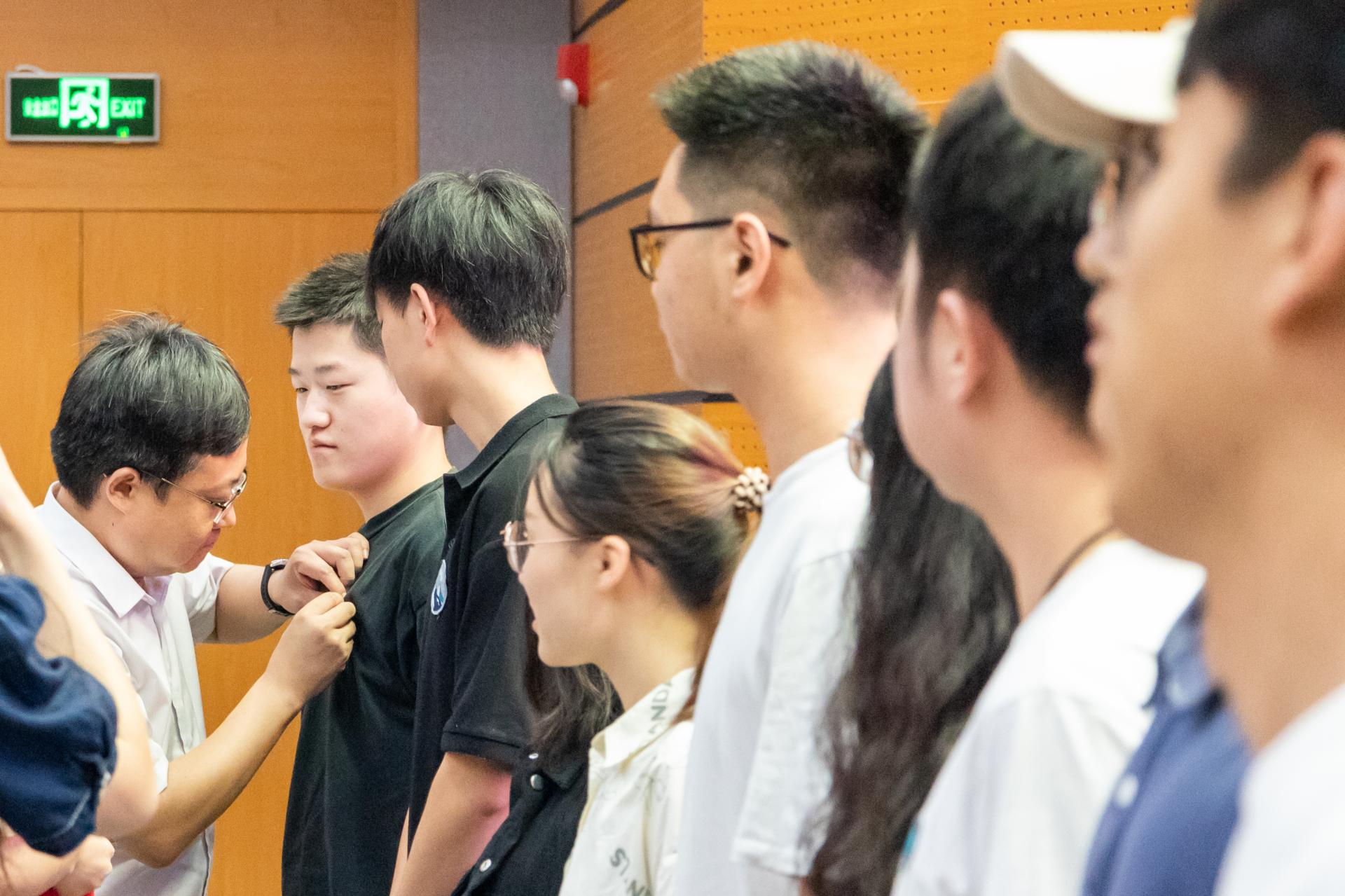 党委书记高复阳为新生代表佩戴院徽。