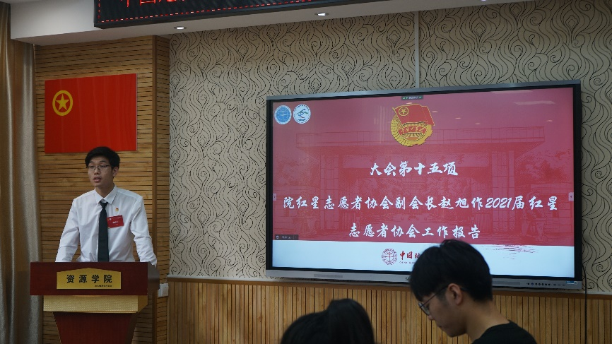 院红星青年志愿者协会副会长赵旭代表红星志协作《筑志愿平台,促青春成长,在志愿服务中擦亮青春底色》工作报告。报告指出,志愿者协会在2021-2022学年间于团队建设、日常活动、深化社区共建、志愿氛围营造、推行南望书屋品牌等方面开展了扎实的工作。报告提到,志协将持续发力,将红星青年志愿者协会打造成为青年人成长成才的大舞台,深化推动建设“地质类”专业志愿服务品牌、“区校共建”社区志愿服务品牌及“南望书屋”爱心服务品牌,大力发展建设专业型志愿服务团队,进一步供给更多更优的志愿服务岗位,引导青年受教育长才干。