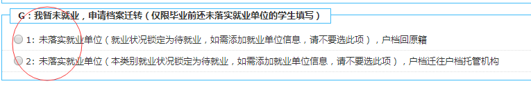 未落实毕业去向的毕业生选择G项,选择“1”户档回原籍。如果未落实就业单位毕业生能够户档托管机构,需向就业中心提供托管机构的接受函,选择“2”。
