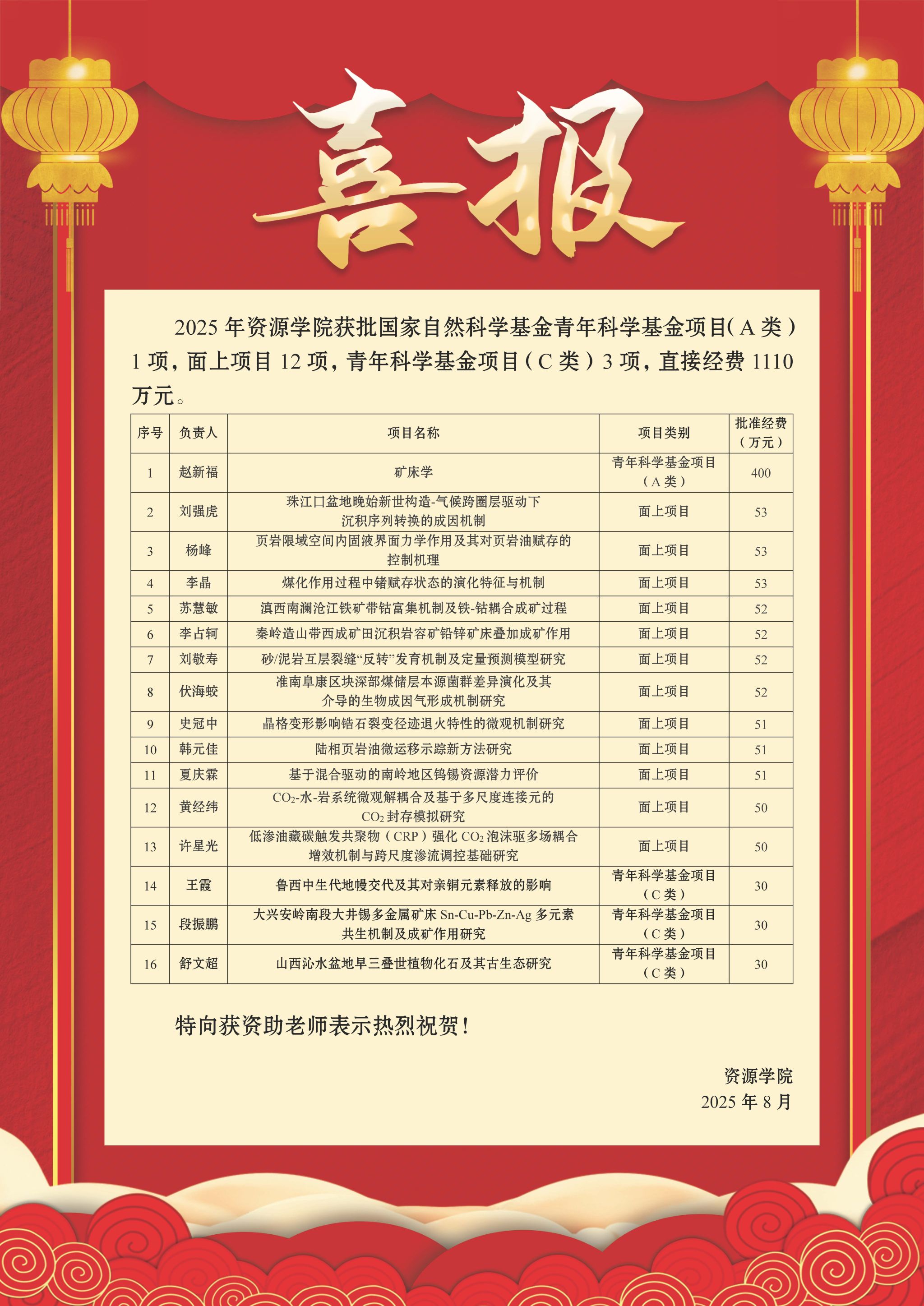 8月27日,国家自然科学基金委员会公布了2025年集中接收期项目评审结果,William威廉英国官网获批资助项目共16项。其中,青年科学基金项目(A类)1项,面上项目12项,青年科学基金项目(C类)3项。项目直接经费达1110万元,较2024年增长63.2%,经费数量位居全校第二。