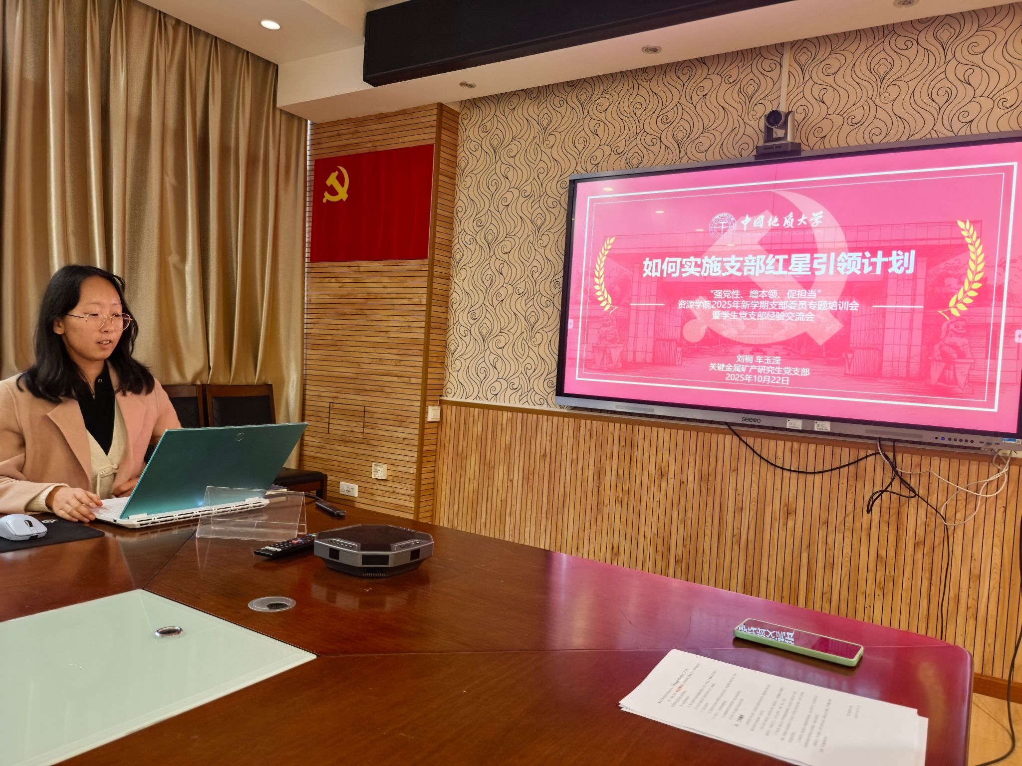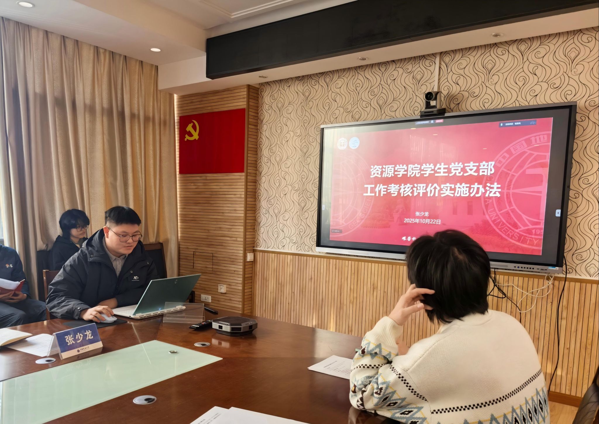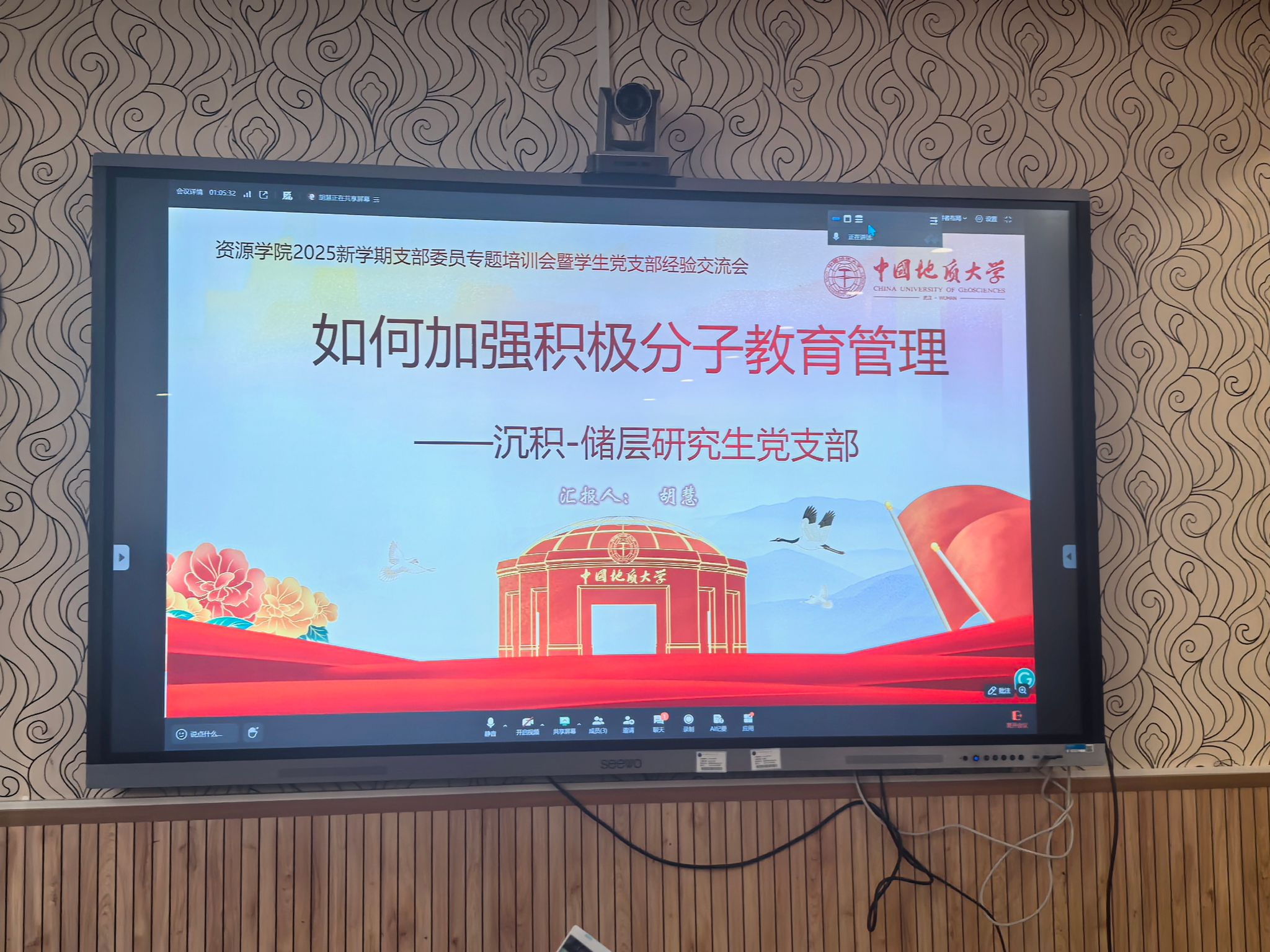 经验交流环节,沉积-储层研究生党支部书记胡慧分享了入党积极分子教育管理的量化评估条例,从学业成绩、学术竞赛、组织生活及答辩群调等多维度展示了培养考察的创新实践。