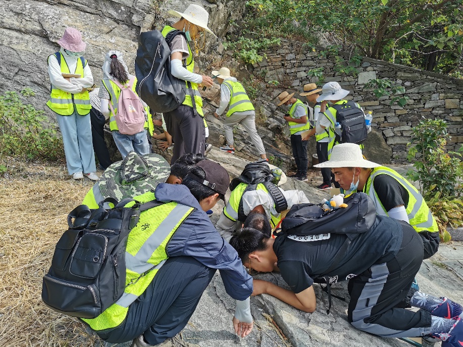 员工在木兰山观察地质现象