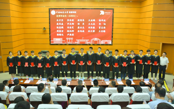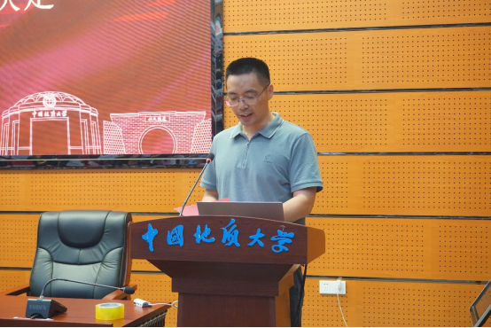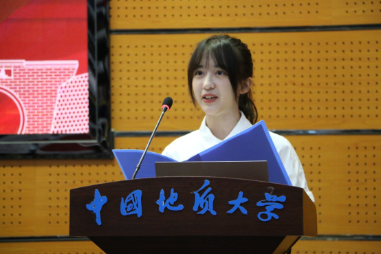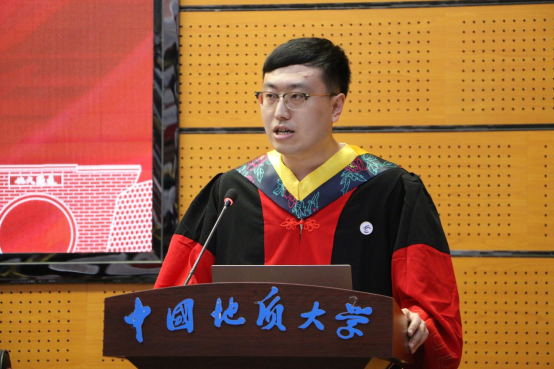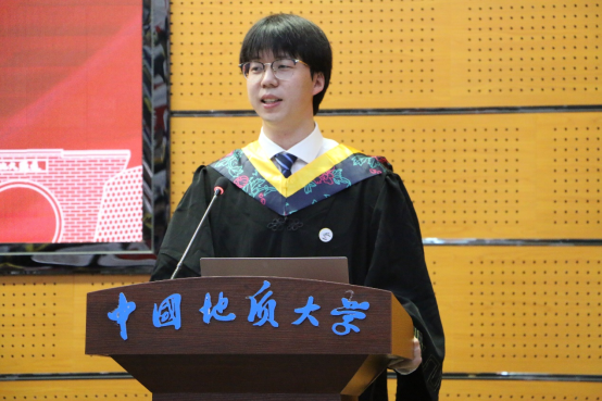 本科生代表、校级优秀共产党员尹燕梁同学发言。他回顾了在地大度过的1390个日夜,回忆最深刻的,是三次野外实习,北戴河初恋、秭归热恋、专业实习,实习是地质人最特殊的记忆;感恩最多的,是传道受业解惑的老师,不舍最浓烈的,是朝夕相处的同学伙伴,他祝福同学们“满怀无限的希望”,立志“为祖国寻找出富饶的矿藏”。