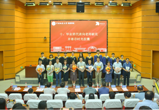 毕业生代表向本科生班主任和系主任献花并寄存时光胶囊,同学们满怀期待走向新的人生阶段,他们用纸笔写下对生活的憧憬,对人生的期盼,大家把梦想清单封存,待母校80周年、90周年、100周年校庆时再次开启,到那时,再次见证初心、见证梦想。