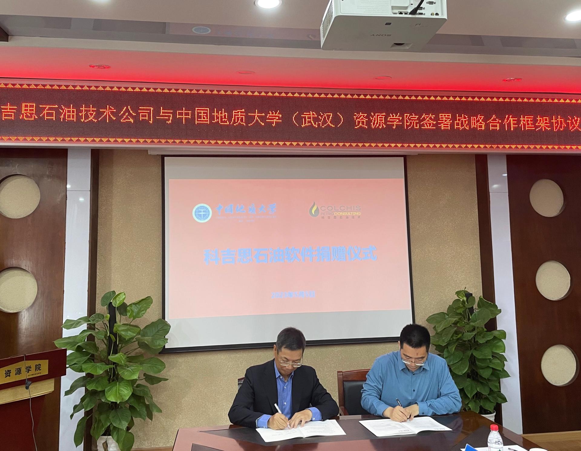 王格平代表科吉思石油技术公司向公司捐赠tNavigator精细油气藏智能高效建模数模一体化、ColchisFM智能油藏地球物理正演软件及许可,与严德天签署战略合作协议,共同为联合实验室揭牌。双方通过战略合作,发挥产学研资源优势,推动tNavigator、ColchisFM软件在公司能源开发领域的科研及教学应用。