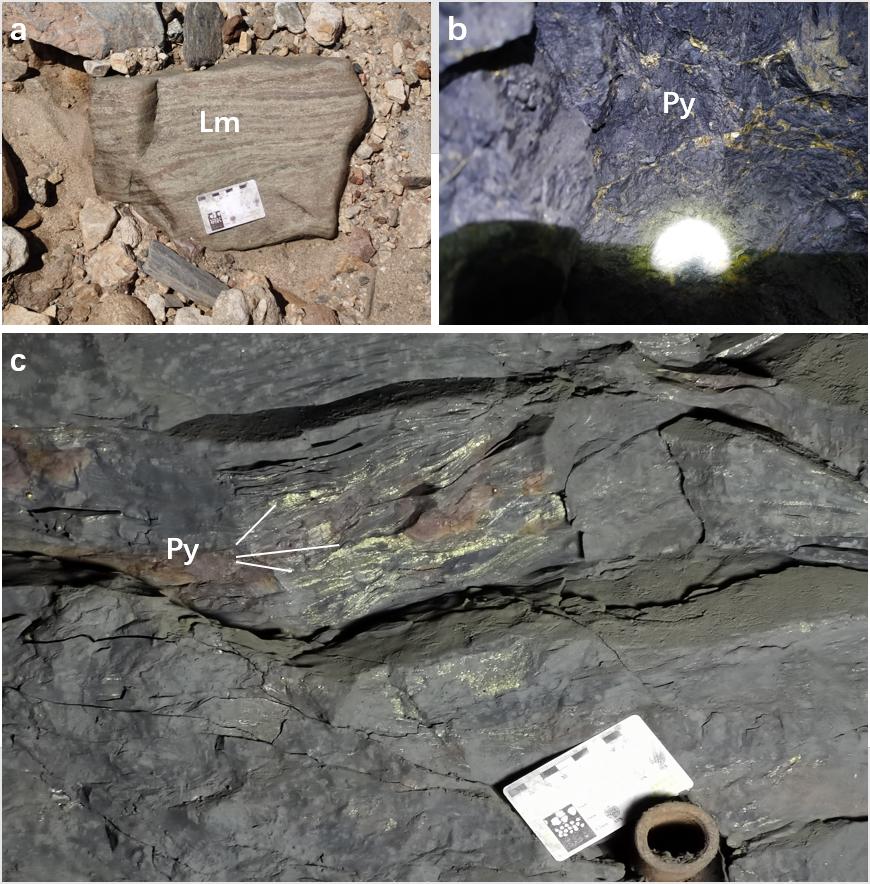 a、c.条带状、纹层状黄铁矿;b.细脉状、网脉状黄铁矿 Py-黄铁矿;Lm-褐铁矿
