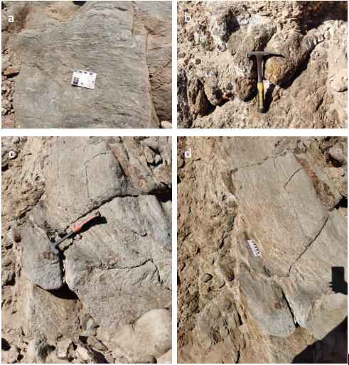a.狼山群一岩组二岩段片麻岩的长英质条带、眼球状构造及旋转碎斑现象;b.二岩组三岩段铁帽;c、d.脉状、条带状褐铁矿化,随地层发生褶曲