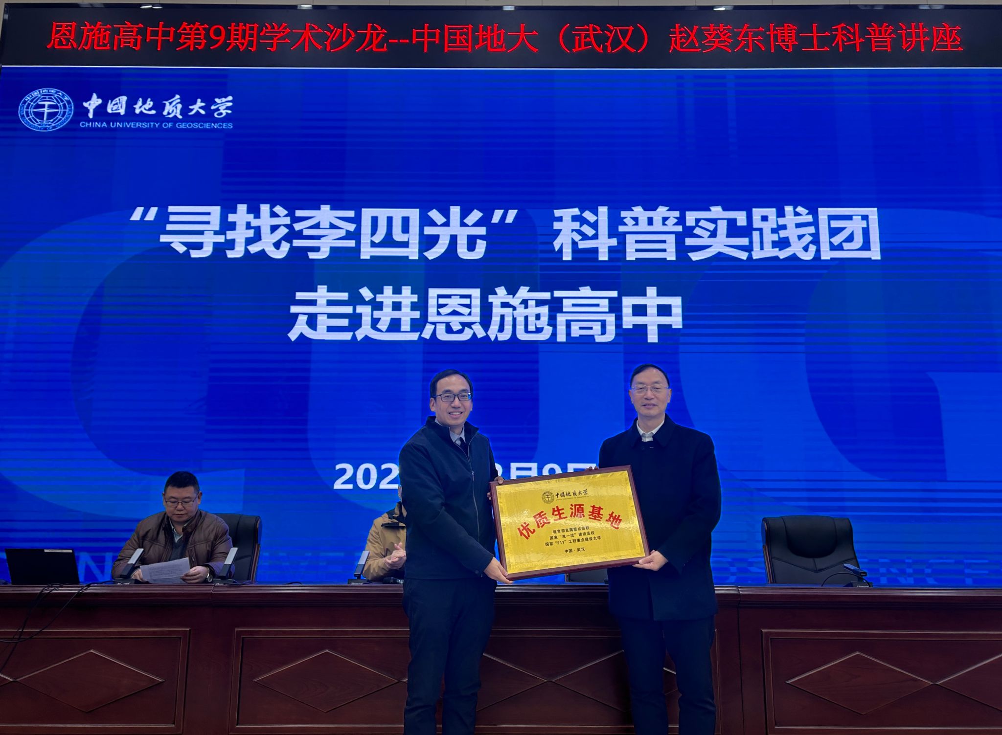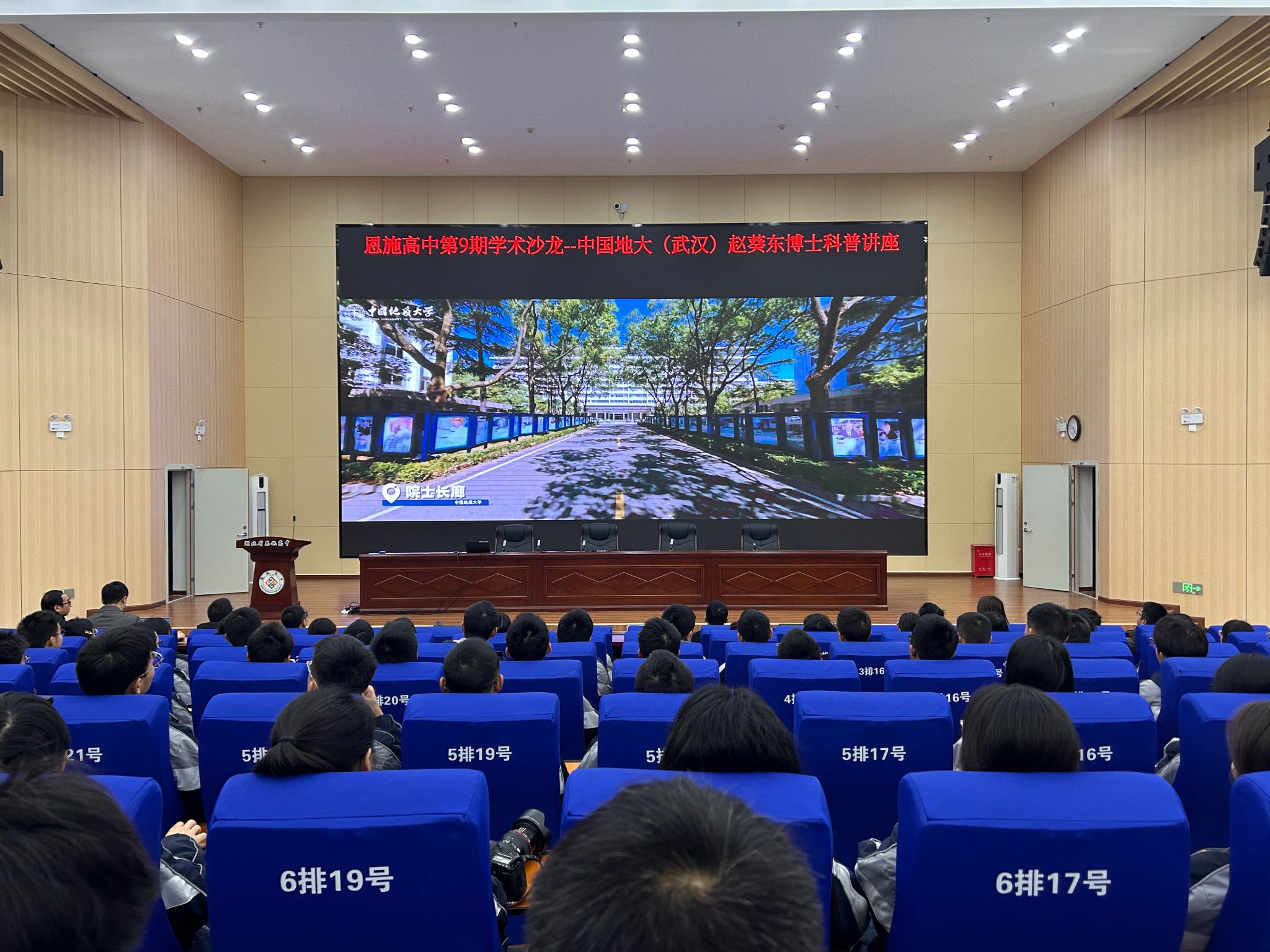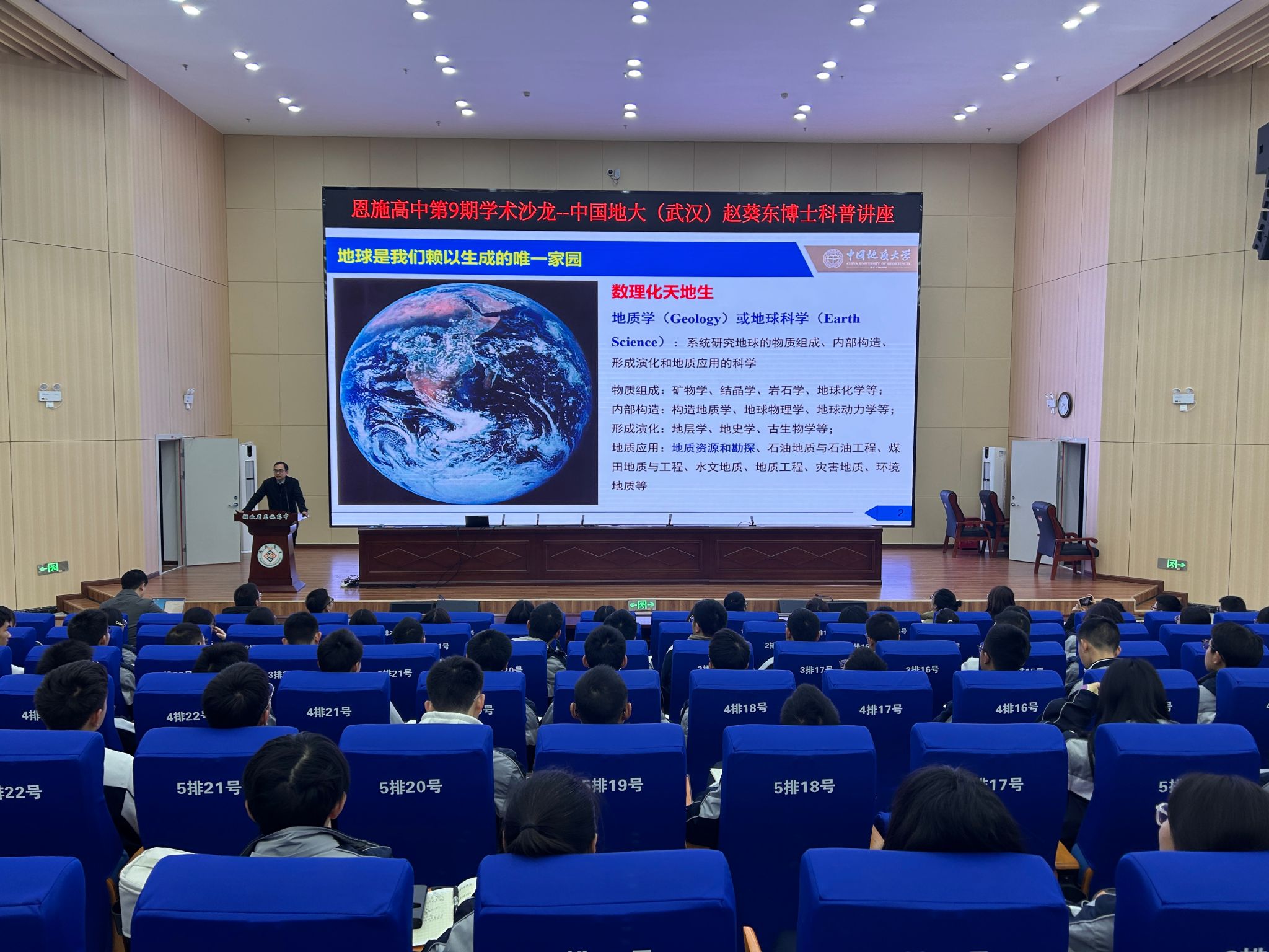 授牌仪式后,赵葵东教授讲授“矿产资源导论”大学先修课。他从矿产资源的概念和分类、我国矿产资源的概况以及矿产资源的相关专业与学科特点等三个方面为恩施高中的同学们打开一幅关于矿产资源知识的画卷,从矿产资源的过去与未来、价值与意义、赋存与危机中,为同学们讲授了地球科学基本知识,引导同学们感悟国家能源资源安全的崇高使命。他谈到,地球科学值得青年一代付出与专研,在沧海桑田宏大的时空观中有着青年广阔的成长舞台。他期待,未来有更多同学立找矿报国大志向,考入williamhill威廉官网,成为有理想、敢担当、能吃苦、肯奋斗的地质“新星”。