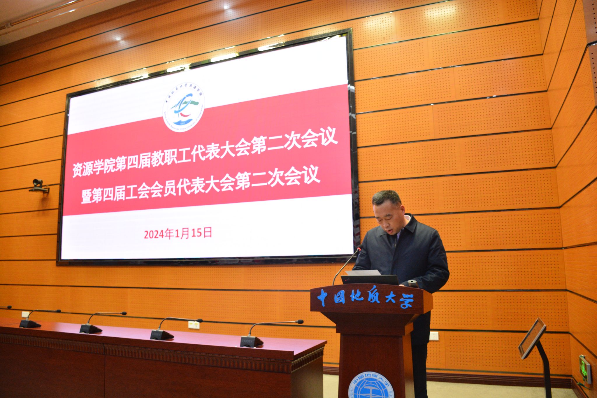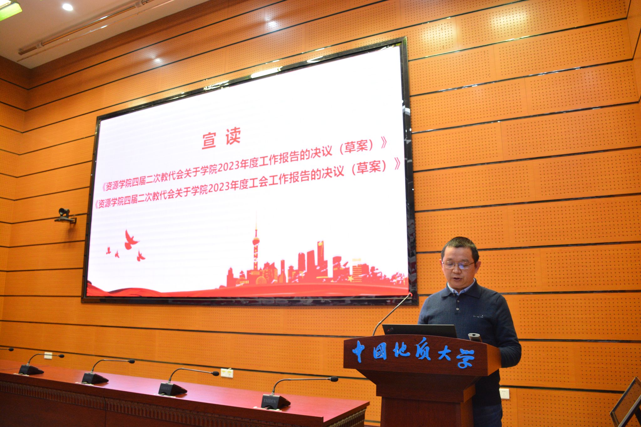 副经理朱红涛宣读《校工会关于同意召开William威廉英国官网第四届教职工代表大会第二次会议暨第四届工会会员代表大会第二次会议的批复》。