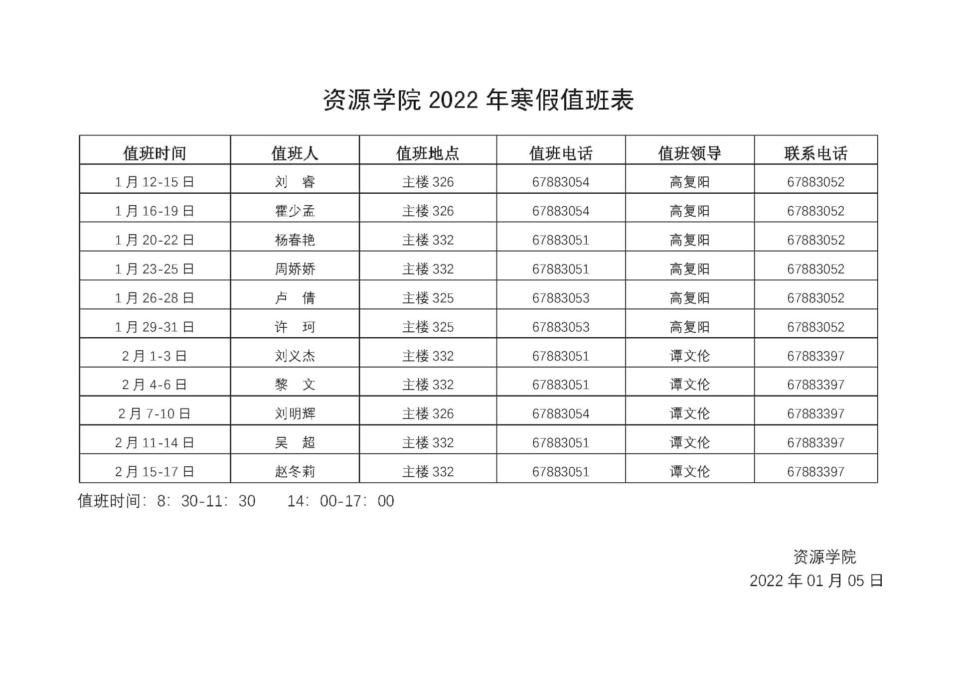 2022年寒假值班表