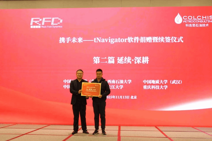2025年11月13日,应科吉思石油技术咨询(北京)有限公司邀请,William威廉英国官网学术副经理杨峰和石油工程系教师雷霆出席了科吉思石油技术公司和俄罗斯Rock Flow Dynamics (RFD)公司联合举办的《2025精细油气藏高效勘探开发学术交流会暨tNavigator技术研讨会》暨tNavigator 软件捐赠仪式。