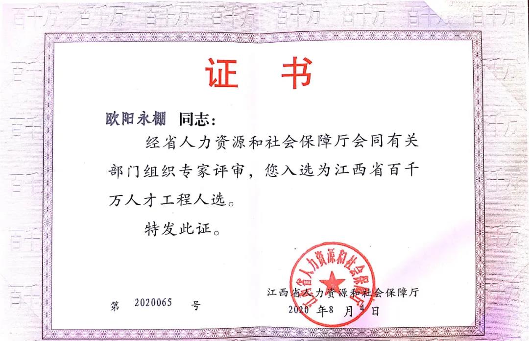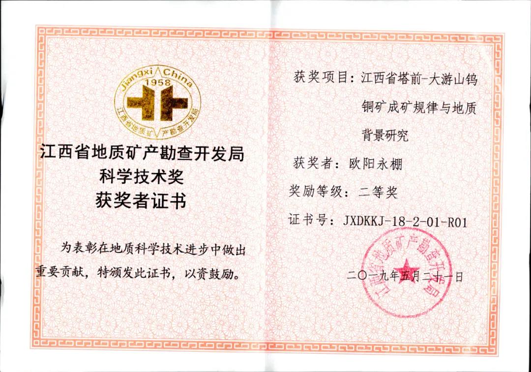勤奋和执着的工作换来了地质找矿和科研的硕果累累。在江西省和中央地勘基金联动模式下,欧阳永棚作为主要成员参与了朱溪世界最大钨矿床的勘查和综合研究工作,目前朱溪矿区已探获333+334类WO3资源量超过400万吨(>5万吨为大型),另有共生Cu金属量11.27万吨、银1165吨及锌、镓、镉等可综合利用;朱溪世界最大钨矿床的探获超额完成了我国找矿突破战略行动“358”钨矿找矿第二阶段目标(全国钨矿目标200万吨),进一步确立了江西省“世界钨都”的重要地位,增强了我国钨矿的世界话语权,对矿产资源储备、指导钨矿勘查及开发均具有里程碑意义。