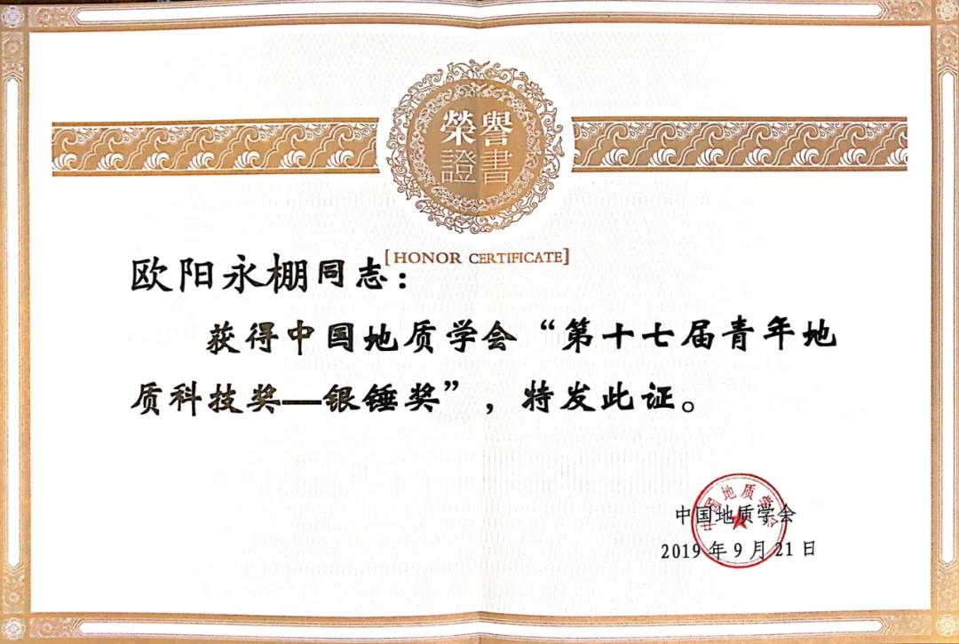在项目参与的基础上,欧阳永棚时刻学习专业知识、关注科研动态,与各大科研高校团队保持密切联系,并还不忘将研究成果总结整理成科技论文发表于诸家刊物。以第一/通讯作者发表SCI3篇、EI 1篇、中文核心8篇;参与编写《朱溪超大型钨铜矿床构造与成矿》、《华南洋-滨太平洋构造演化与成矿作用》等专著。先后10次参加国内外地质专业会议,并做口头报告8次,亦获得过1次优秀口头报告奖。撰写的论文《朱溪式与岩浆活动有关的矽卡岩型矿床“特征”》从20多位参赛选手中脱颖而出,被评为江西省生态地质环境学会2016年科技论坛学术论文交流一等奖。